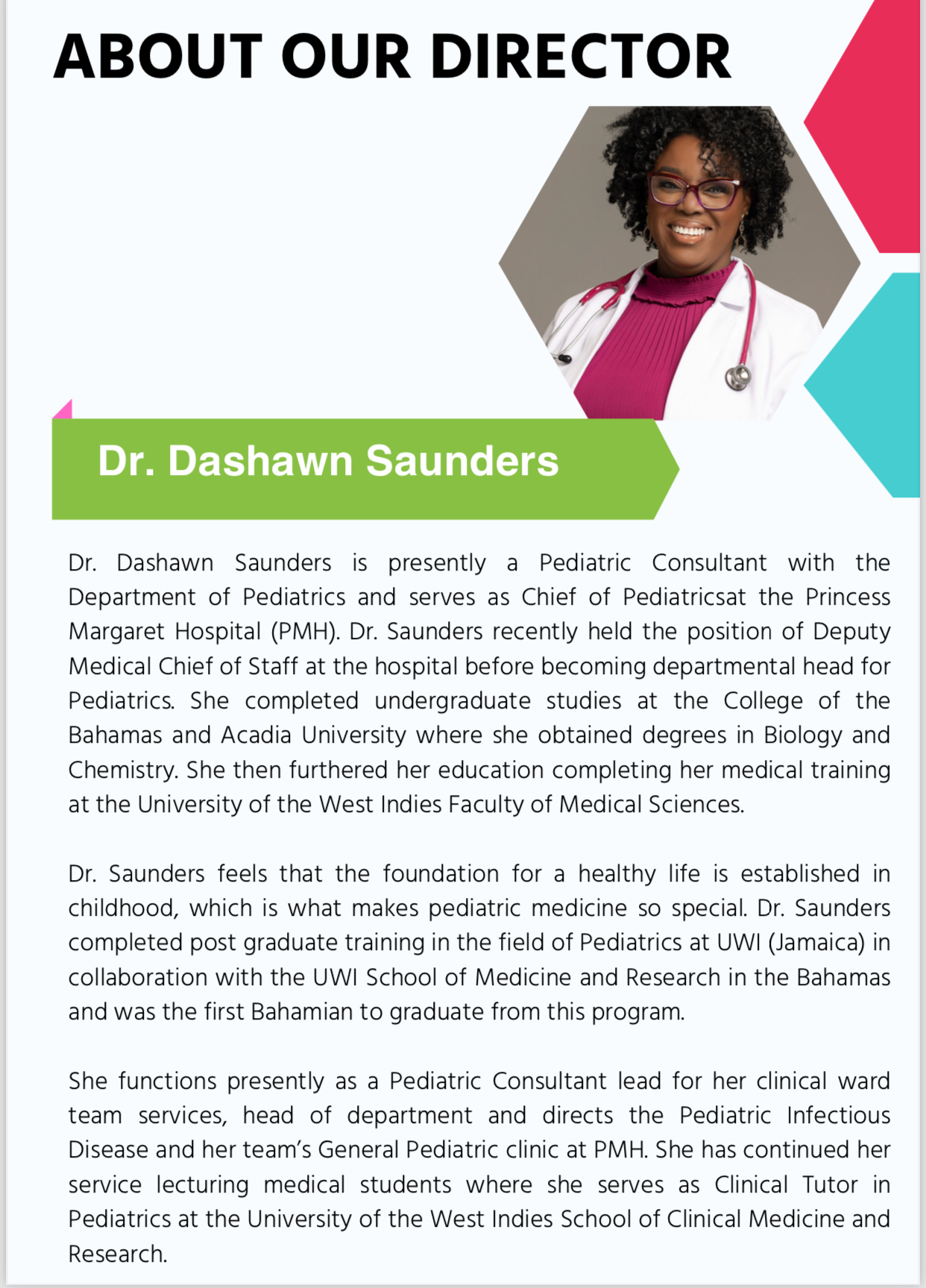 Dr. Saunders has over 18 years experience in the pediatric field and her focus is on child development and well being.